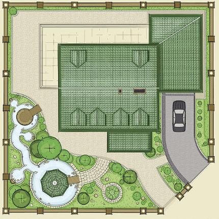 Estate & acreage layouts with driveways, arrival moments, and outdoor zones